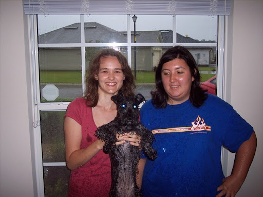 This is the end result of our adventure out into the storm so Pretinha could potty. (If the picture is to small to see detail...Our hair is windblown, our clothes are wet and Pretinha is drenched to the point that it would appear she just had a bath!)